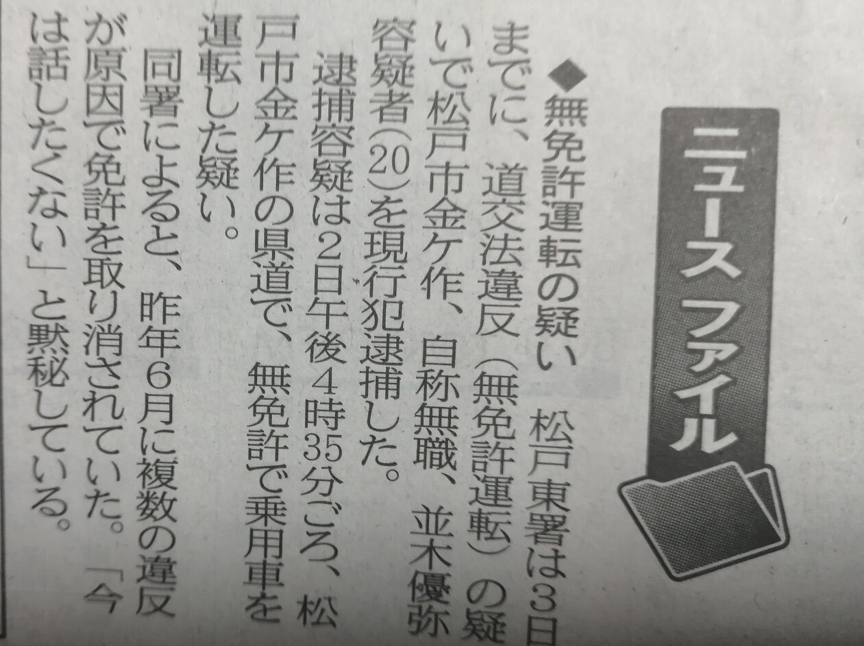 1月2日午後4時36分頃、松戸市金ケ作の道路で、無免許で普通乗用車を運転していた自称無職の男(20)を逮捕